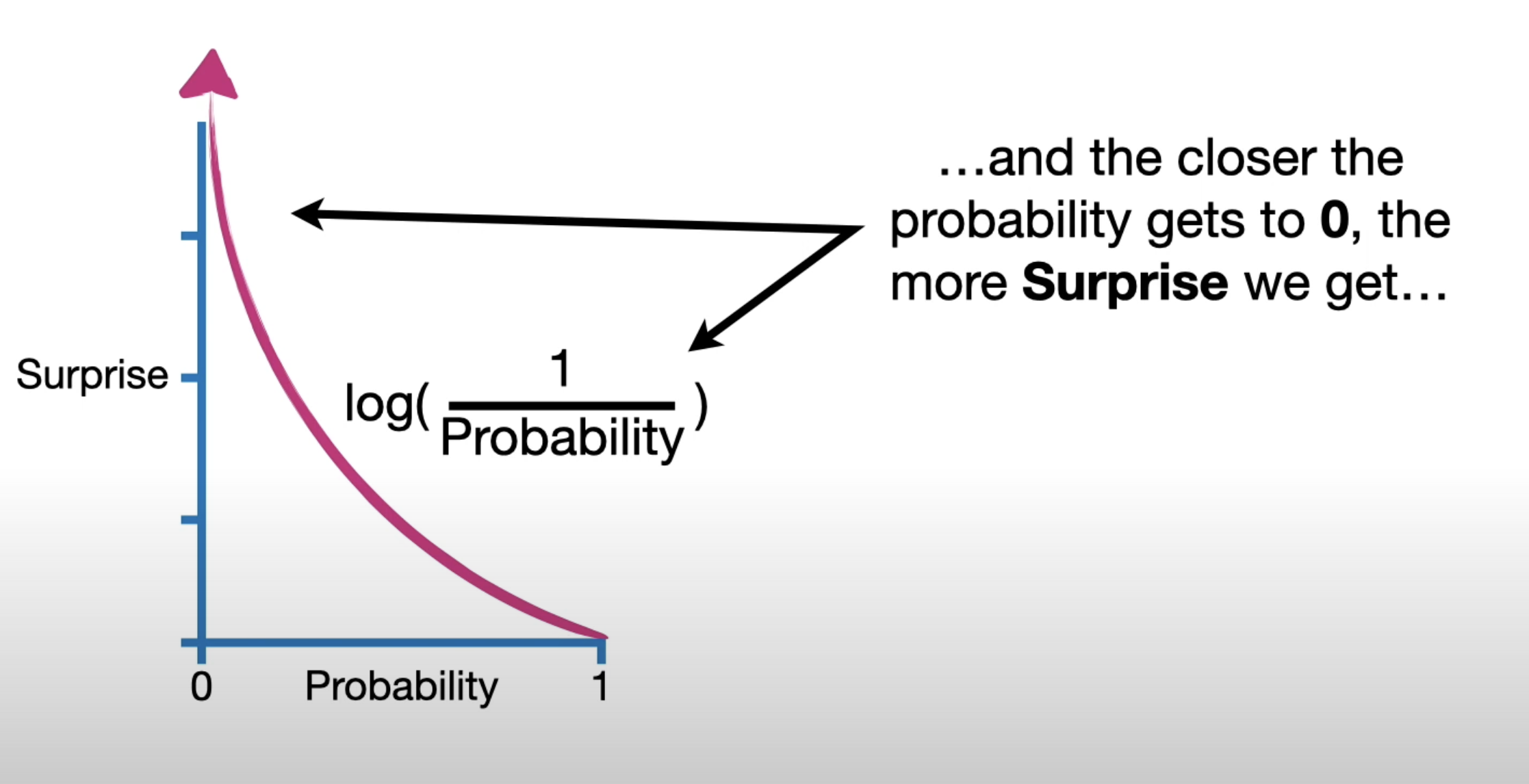 Surprise is also known as ‘self information’ and basically quantifies how surprised you would be about something happening.